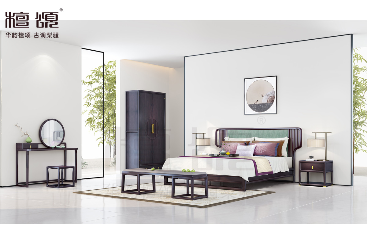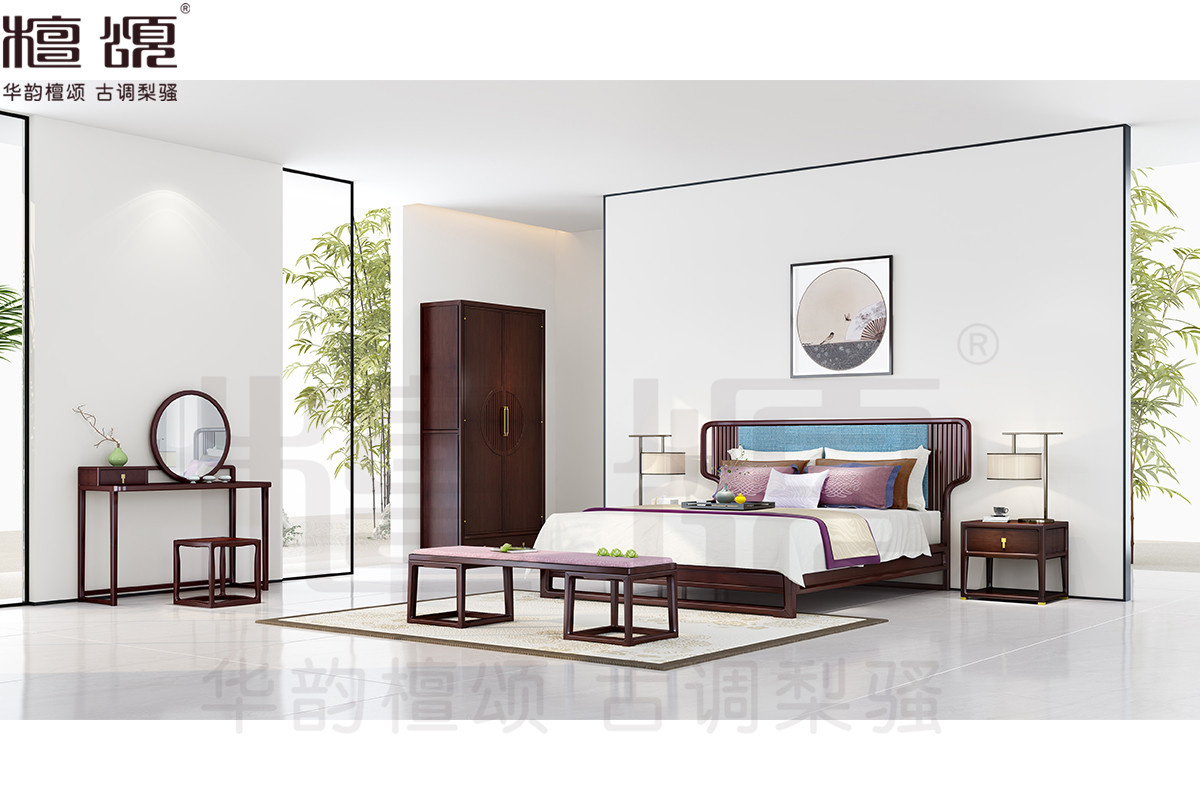 產(chǎn)品組合:床+2床頭柜+床尾凳+兩門衣柜+梳妝臺+梳妝凳